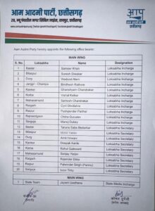 प्रदेश अध्यक्ष कोमल हुपेंडी ने बताया कि रायपुर लोकसभा प्रभारी की जिम्मेदारी पुष्पेंद्र परिहार और लोकसभा सचिव की जिम्मेदारी पलविंदर सिंह पन्नू को दी गई है। आम आदमी पार्टी पूरे जोश के 2023 के चुनाव की तैयारी में युवाओं के साथ जुट गई है और एक ईमानदार सरकार बनाने की ओर अग्रसर है।