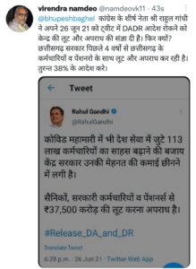 रायपुर/भारतीय राज्य पेंशनर्स महासंघ के राष्ट्रीय महामन्त्री तथा छत्तीसगढ़ राज्य कर्मचारी संघ के पूर्व प्रांताध्यक्ष वीरेन्द्र नामदेव ने मुख्यमंत्री भूपेश बघेल को ट्वीट कर कहा है कि कांग्रेस के शीर्ष नेता पूर्व राष्ट्रीय अध्यक्ष राहुल गांधी ने अपने 26 जून 21 के एक ट्वीट में कर्मचारियों एवं पेंशनरों के लिए महंगाई भत्ता व महंगाई राहत के आदेश जारी करने की केन्द्र सरकार से मांग करते हुए इसे लूट और अपराध की संज्ञा दी है। फिर क्यों? छत्तीसगढ़ सरकार पिछले 4 वर्षो से छत्तीसगढ़ राज्य के कर्मचारियों व पेंशनरो के साथ लूट और अपराध कर रही है।