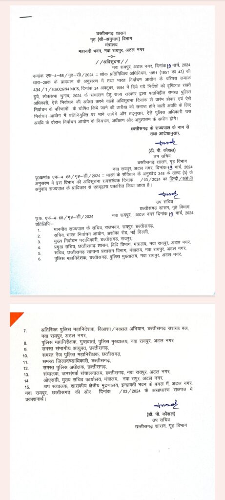 रायपुर, / लोकसभा चुनाव-2024 के संचालन हेतु राज्य सरकार के समस्त पुलिस अधिकारी निर्वाचन आयोग में प्रतिनियुक्ति पर माने जाएंगे तथा आयोग के नियंत्रण में रहेंगे। इस संबंध में छत्तीसगढ़ शासन के गृह विभाग द्वारा मंत्रालय महानदी भवन नवा रायपुर, अटलनगर से आज इस आशय के अधिसूचना जारी कर दी गई है।