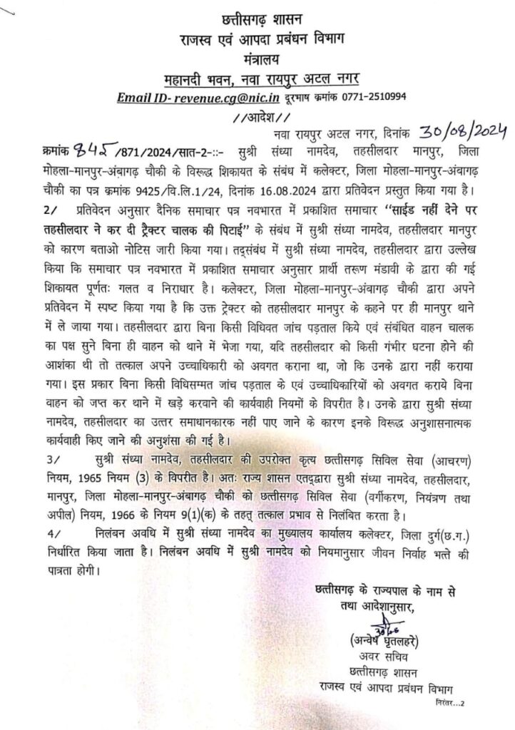 रायपुर। मोहला मानपुर अंबागढ़ चौकी जिले के मानपुर तहसील में पदस्थ तहसीलदार संध्या नामदेव को निलंबित कर दिया गया है। इस संबंध में अवर सचिव राजस्व एवं आपदा प्रबंधन विभाग ने आदेश जारी कर दिया है। मामला साइड नहीं देने पर ट्रैक्टर चालक की पिटाई का है।